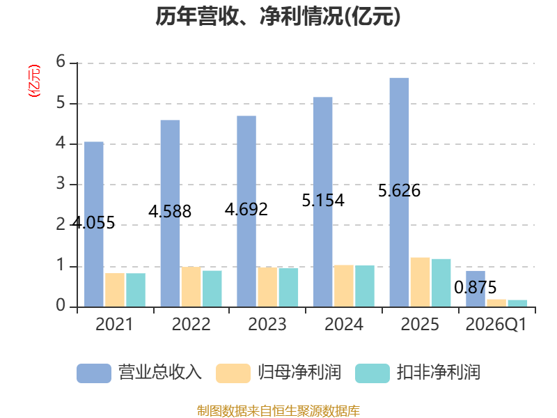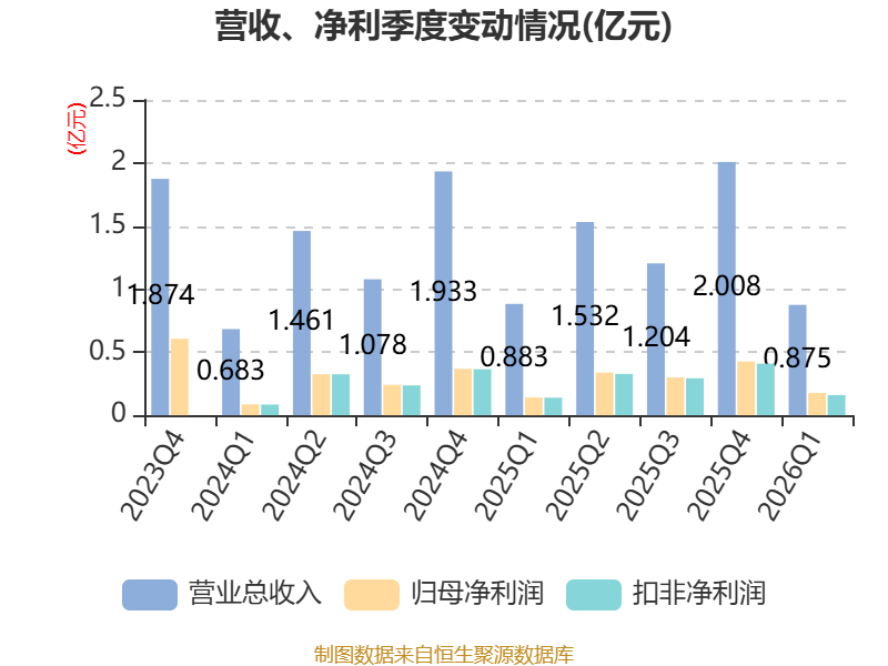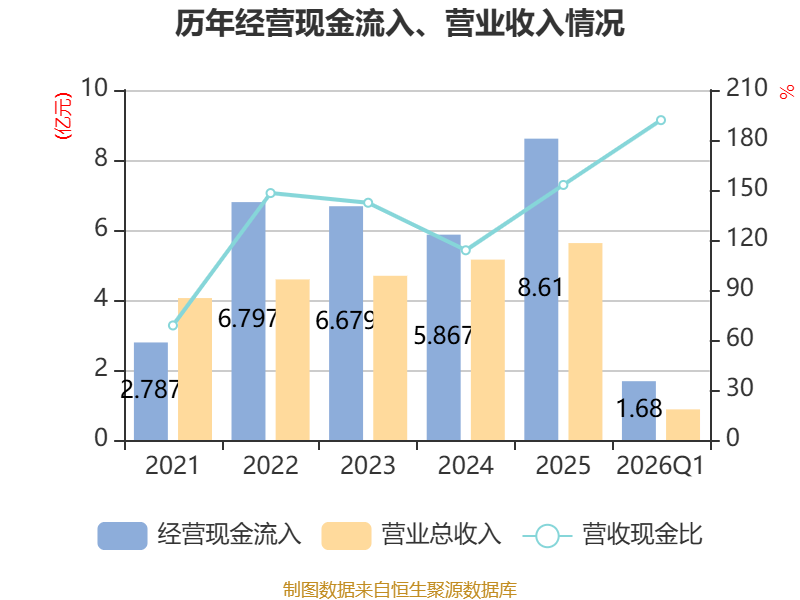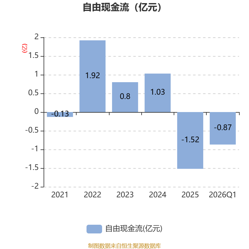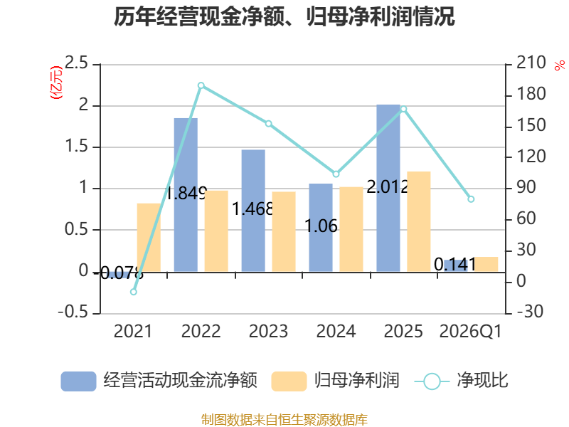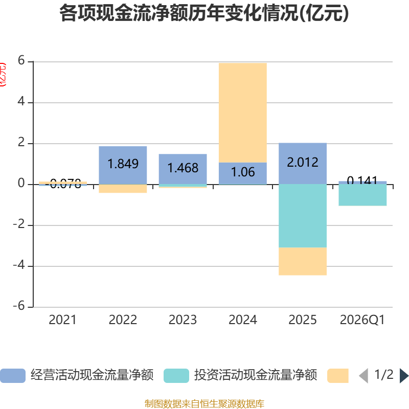 截至2026年一季度末,公司经营活动现金流净额为1411.06万元,同比下降26.5%;筹资活动现金流净额-59.06万元,同比增加1525.24万元;投资活动现金流净额-1.06亿元,上年同期为-2.01亿元。