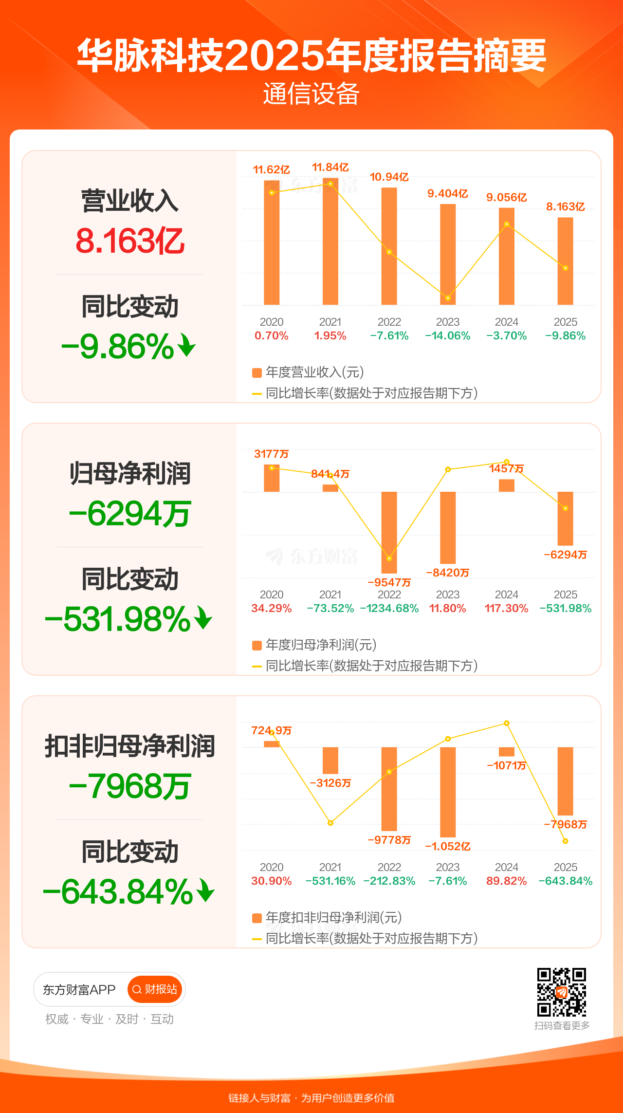 华脉科技4月21日发布2025年年报显示,公司全年实现营业收入8.16亿元,同比下滑9.86%;归母净利润-6293.69万元;扣非归母净利润-7968.27万元。