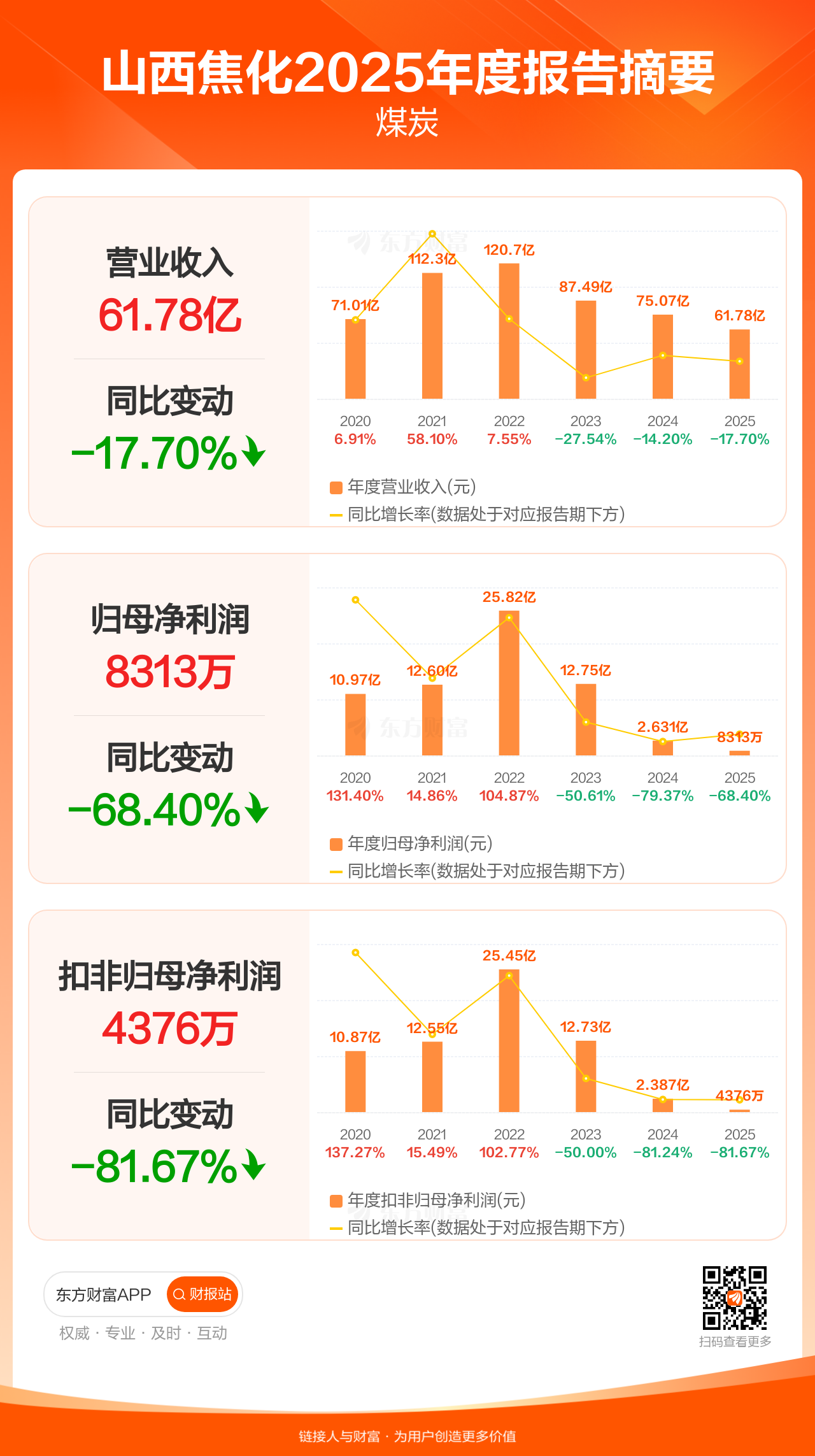 山西焦化4月21日发布2025年年报显示,公司全年实现营业收入61.78亿元,同比下滑17.70%;归母净利润8313.46万元,同比下滑68.40%;扣非归母净利润4375.68万元,同比下滑81.67%。