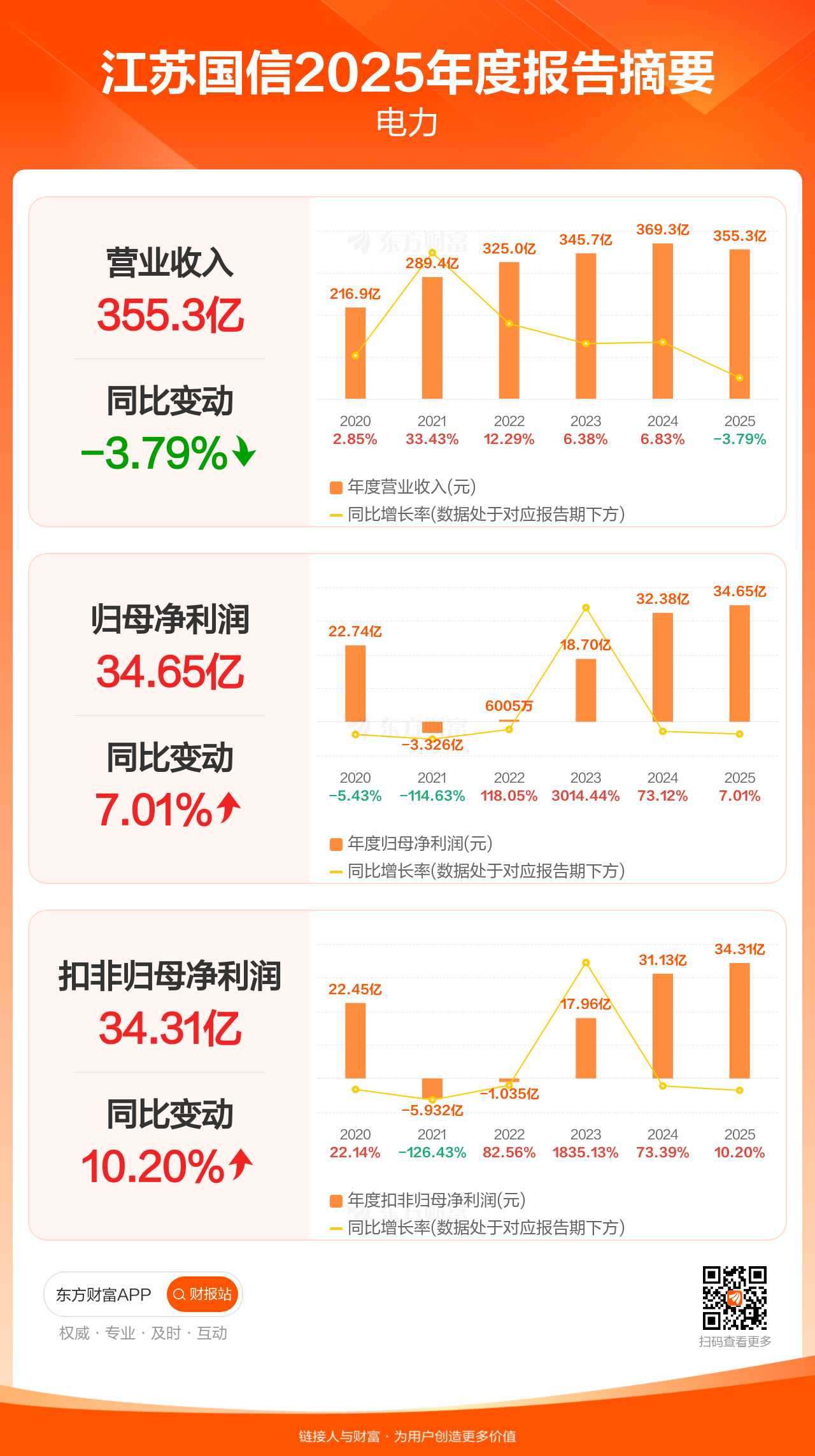 江苏国信4月21日发布2025年年报显示,公司全年实现营业收入355.31亿元,同比下滑3.79%;归母净利润34.65亿元,同比增长7.01%;扣非归母净利润34.31亿元,同比增长10.20%。