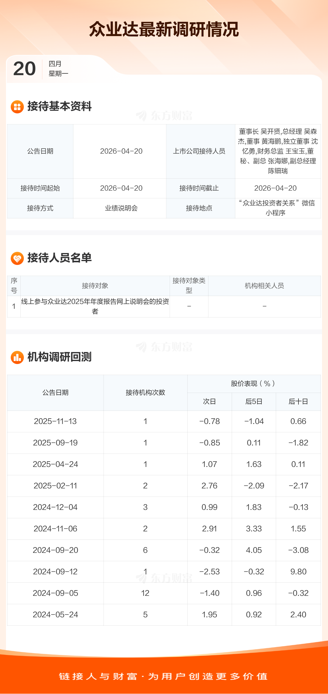 众业达4月20日公告称,4月20日接待线上参与众业达2025年年度报告网上说明会的投资者调研。接待人员包括董事长 吴开贤,总经理 吴森杰,董事 黄海鹏,独立董事 沈忆勇,财务总监 王宝玉,董秘、副总 张海娜,副总经理 陈钿瑞。