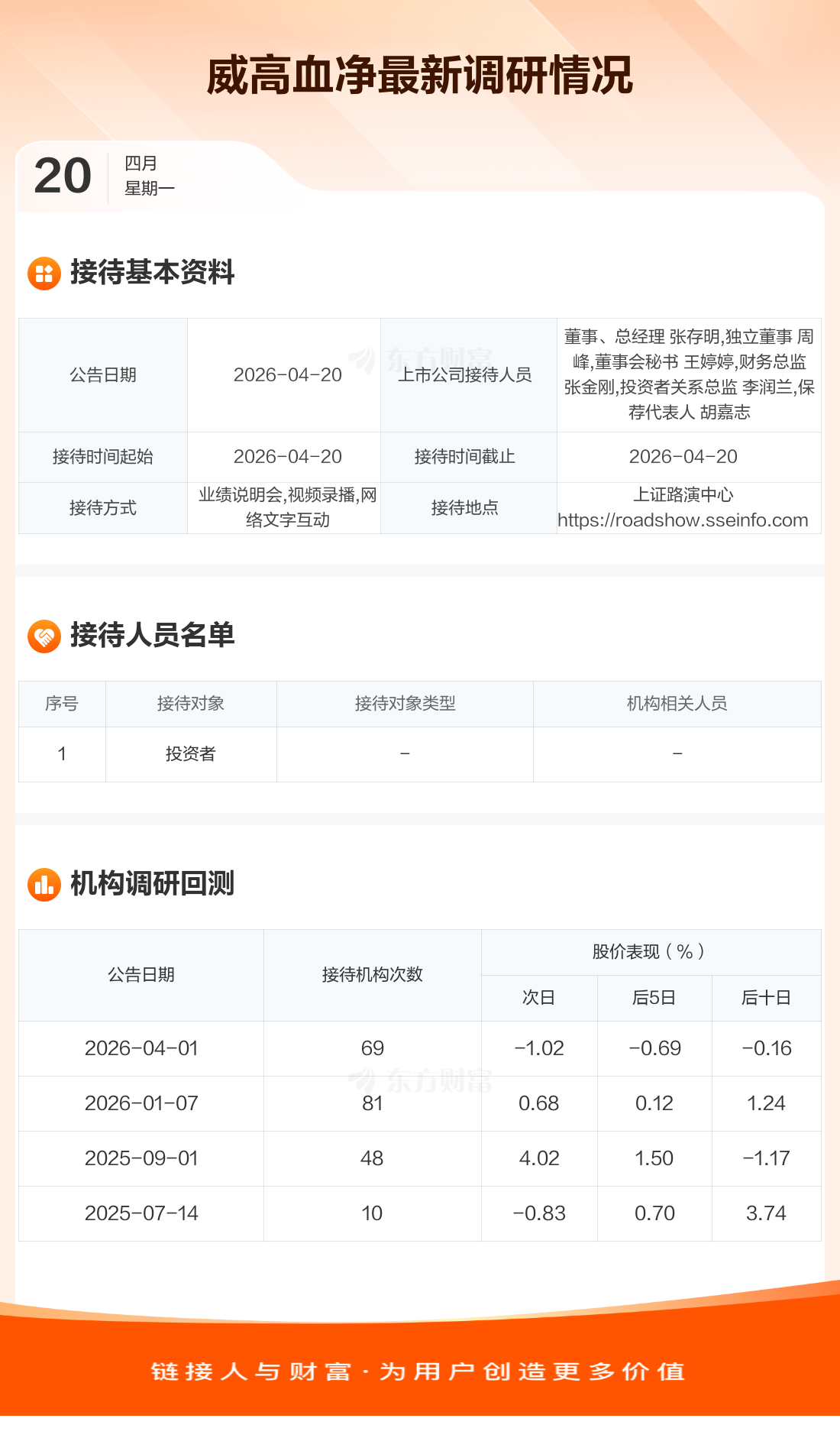 威高血净4月20日公告称,4月20日接待投资者调研。接待人员包括董事、总经理 张存明,独立董事 周峰,董事会秘书 王婷婷,财务总监 张金刚,投资者关系总监 李润兰,保荐代表人 胡嘉志。
