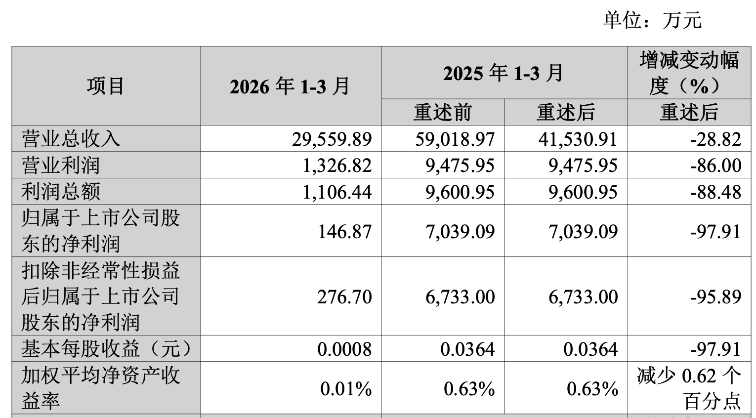 国盛证券同日发布业绩快报,2026年一季度,公司实现营业总收入2.96亿元,同比下降28.82%;利润总额1106.44万元,同比下降88.48%;归母净利润146.87万元,同比下降97.91%;扣非净利润276.70万元,同比下降95.89%。