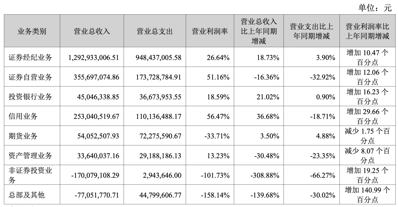 年报显示,公司证券自营业务营业支出同比下降32.92%,主要系与收入相关的支出同比减少。信用业务营业总收入同比上升36.68%,主要系融出资金业务利息净收入增加的影响。资产管理业务营业总收入同比下降30.48%,主要系资产管理业务手续费净收入减少的影响。