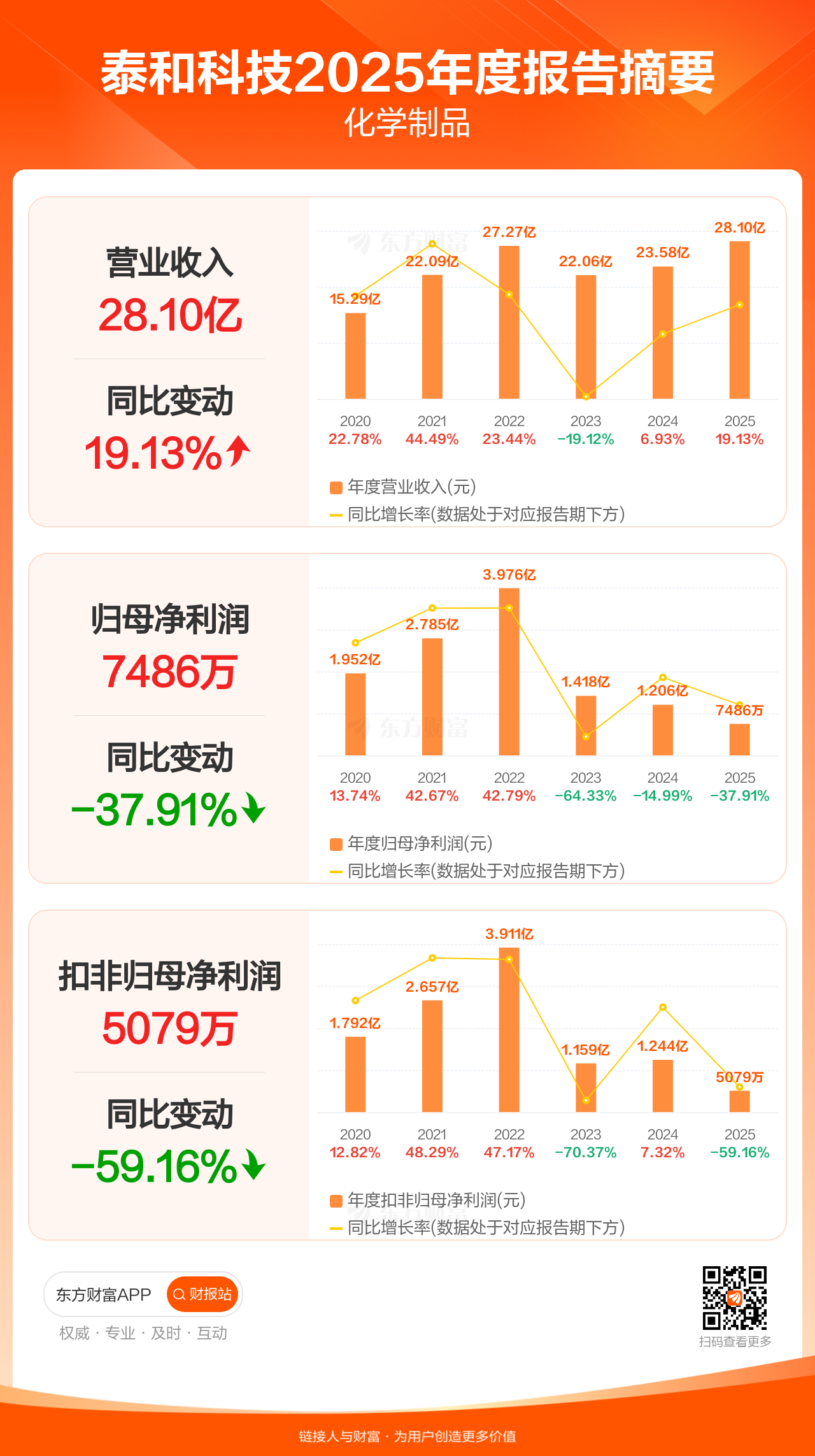泰和科技4月21日发布2025年年报显示,公司全年实现营业收入28.10亿元,同比增长19.13%;归母净利润7486.18万元,同比下滑37.91%;扣非归母净利润5079.46万元,同比下滑59.16%。