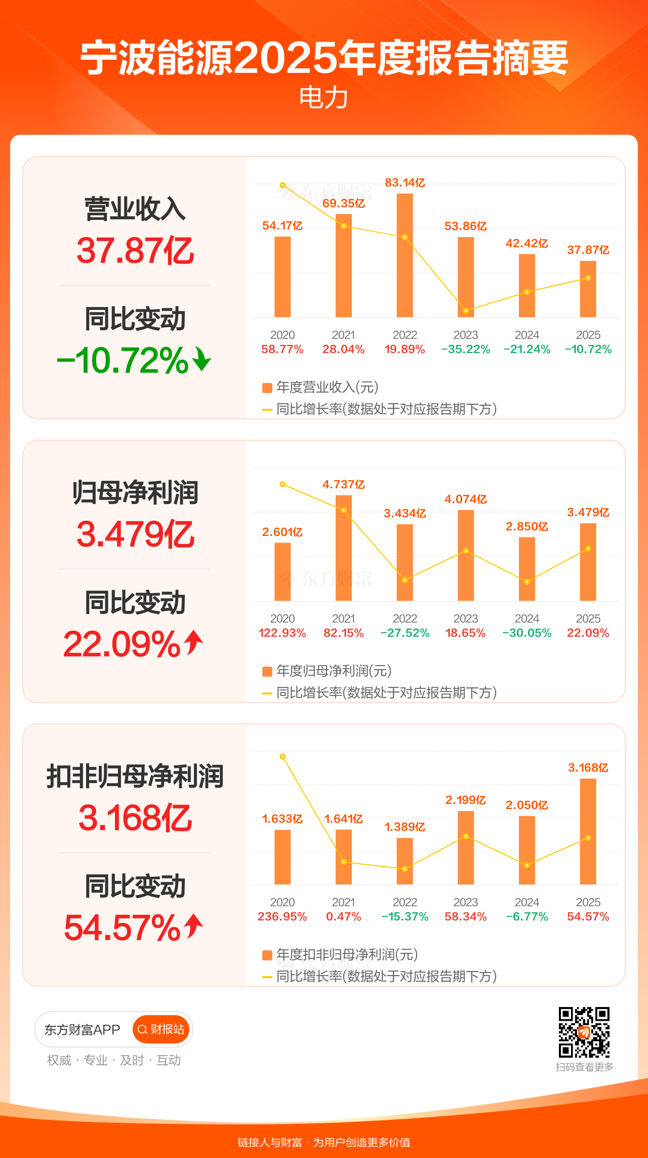 宁波能源4月21日发布2025年年报显示,公司全年实现营业收入37.87亿元,同比下滑10.72%;归母净利润3.48亿元,同比增长22.09%;扣非归母净利润3.17亿元,同比增长54.57%。