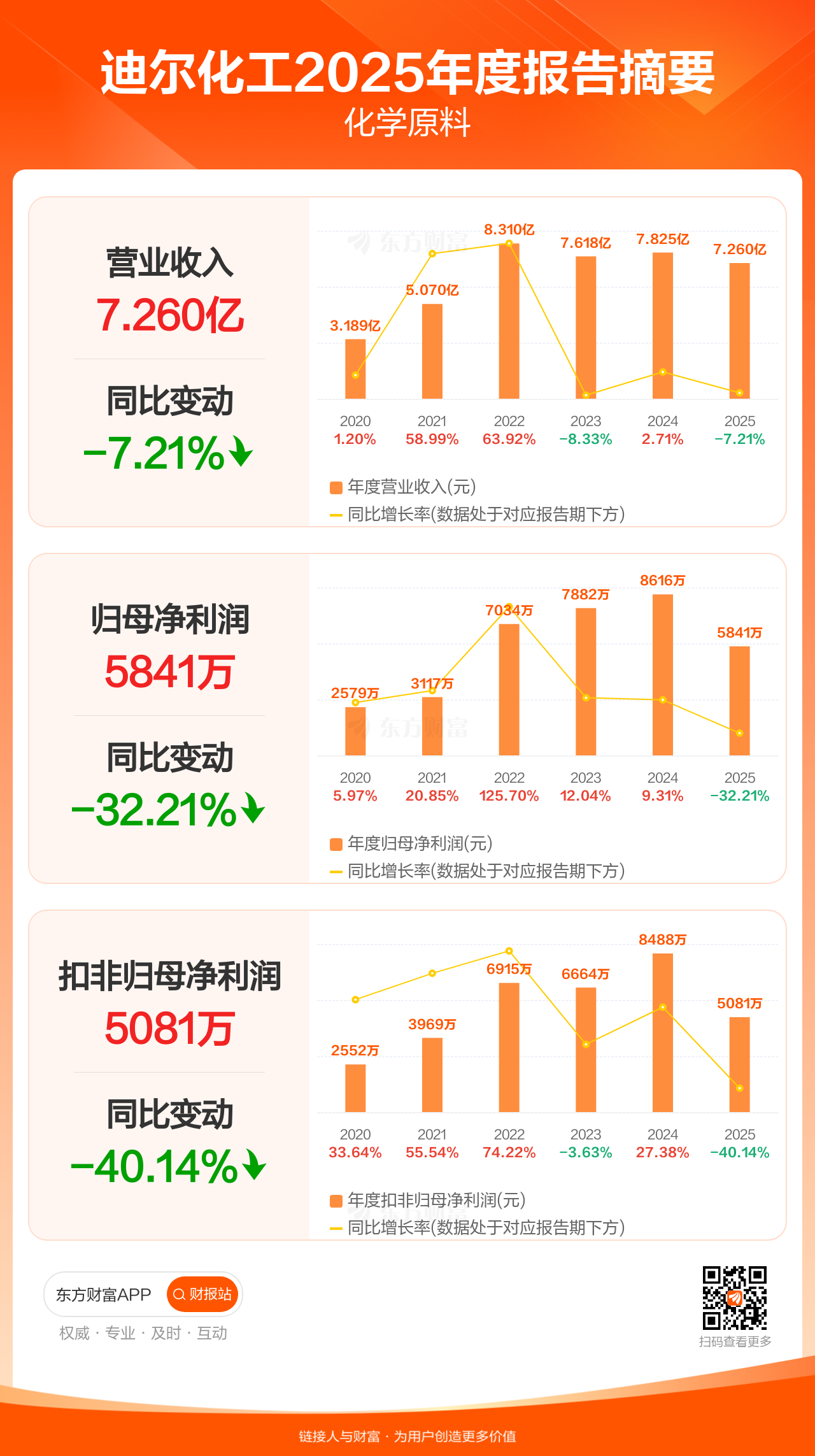迪尔化工4月20日发布2025年年报显示,公司全年实现营业收入7.26亿元,同比下滑7.21%;归母净利润5840.79万元,同比下滑32.21%;扣非归母净利润5081.41万元,同比下滑40.14%。