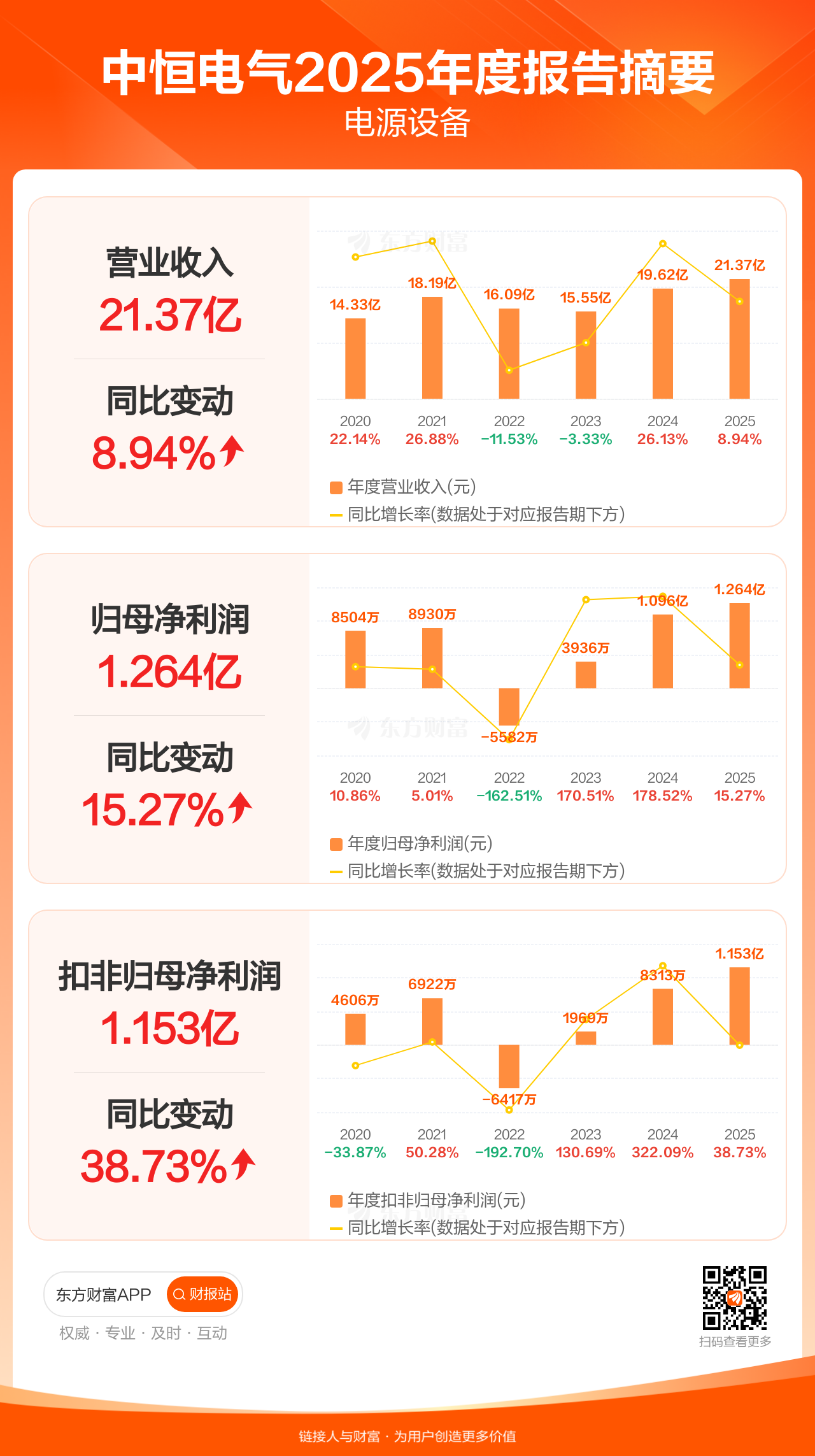 中恒电气4月21日发布2025年年报显示,公司全年实现营业收入21.37亿元,同比增长8.94%;归母净利润1.26亿元,同比增长15.27%;扣非归母净利润1.15亿元,同比增长38.73%。