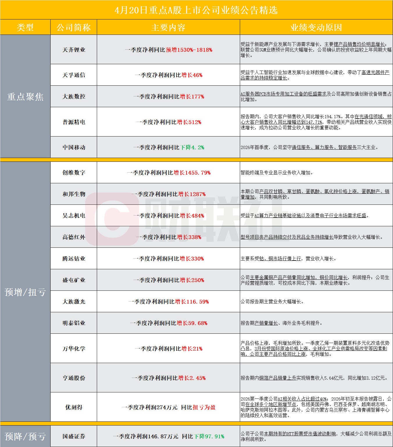 据财联社不完全统计,截至发稿,盘后包括天齐锂业、天孚通信、大族数控、普源精电、中国移动、创维数字、和邦生物、昊志机电、高德红外、腾远钴业、盛屯矿业、大族激光、明泰铝业、万华化学、亨通股份、优刻得、国盛证券在内的多家A股上市公司发布2026年一季度业绩预告/报告。