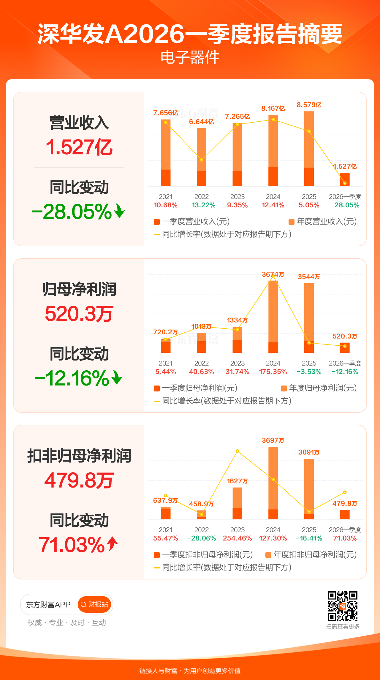 深华发A4月21日发布2026年一季报显示,公司一季度实现营业收入1.53亿元,同比下滑28.05%;归母净利润520.31万元,同比下滑12.16%;扣非归母净利润479.78万元,同比增长71.03%。