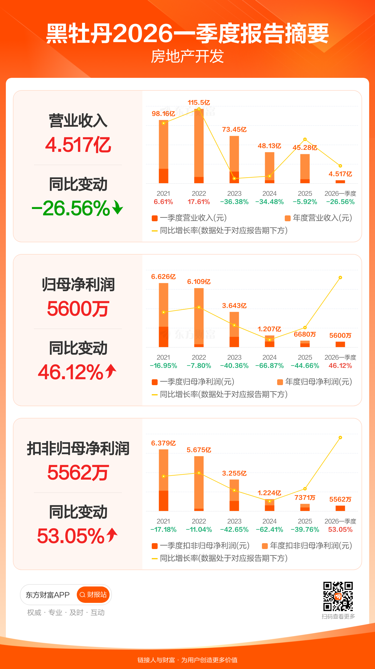 黑牡丹4月21日发布2026年一季报显示,公司一季度实现营业收入4.52亿元,同比下滑26.56%;归母净利润5600.07万元,同比增长46.12%;扣非归母净利润5562.02万元,同比增长53.05%。