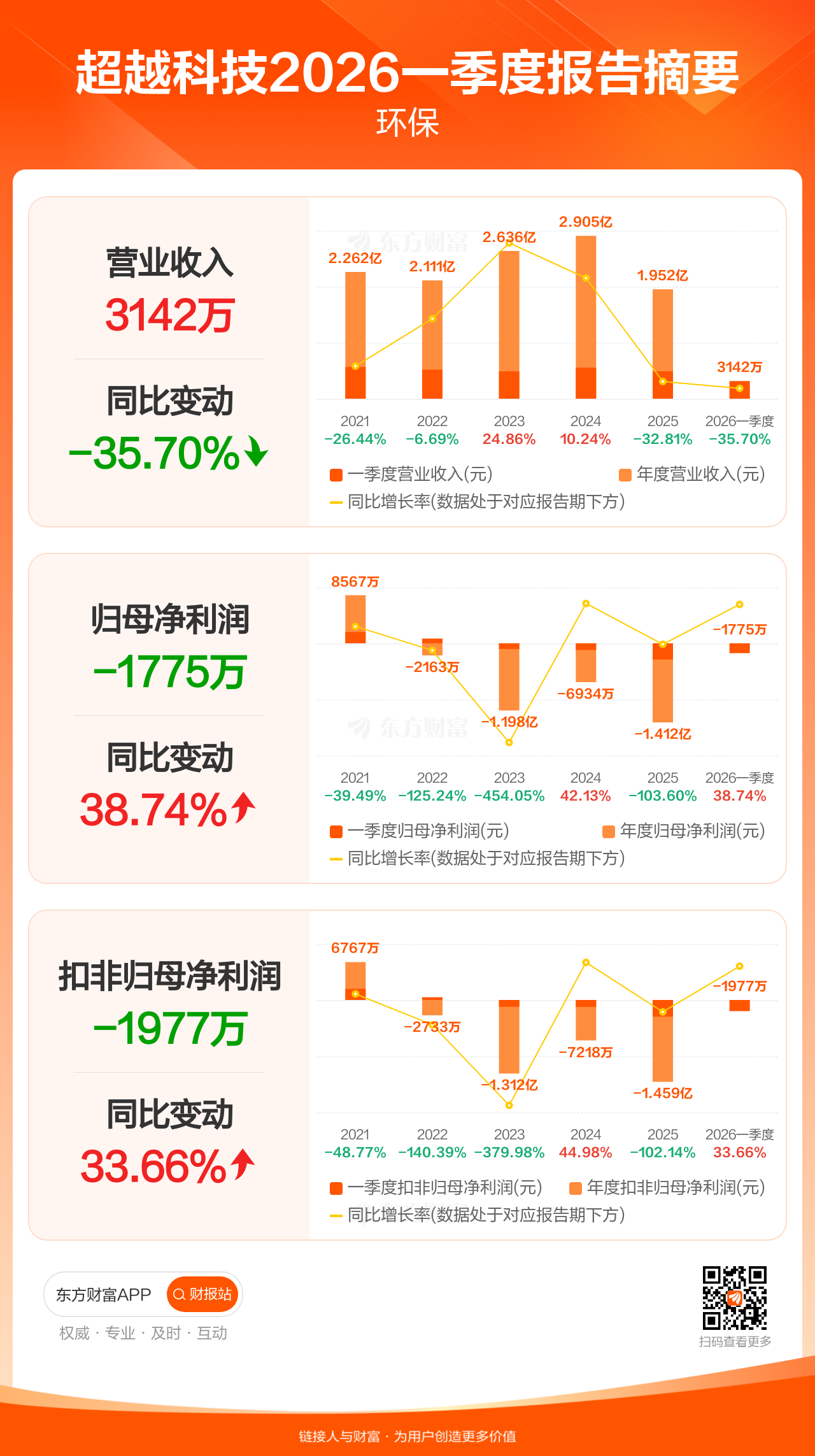 超越科技4月21日发布2026年一季报显示,公司一季度实现营业收入3141.83万元,同比下滑35.70%;归母净利润-1775.08万元;扣非归母净利润-1976.67万元。