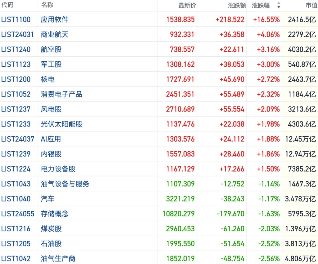 其他方向上,AI主线行情继续火热,群核科技上市第二日涨幅再度翻倍,表现尤其抢眼,智谱、MiniMax等板块龙头也进一步走强。此外,航空、光伏、银行、军工、电力股均有所走强。
