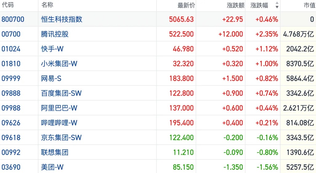盘面上,大型科网股多数活跃,其中腾讯涨超2%,小米涨1%,百度、阿里巴巴涨幅在1%以内,美团跌逾1%。