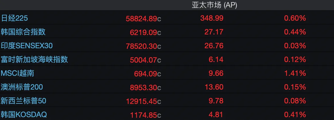 今日亚太股市也全线收涨,在局势暂时可控背景下,市场风险偏好和资金回流共振继续修复行情。