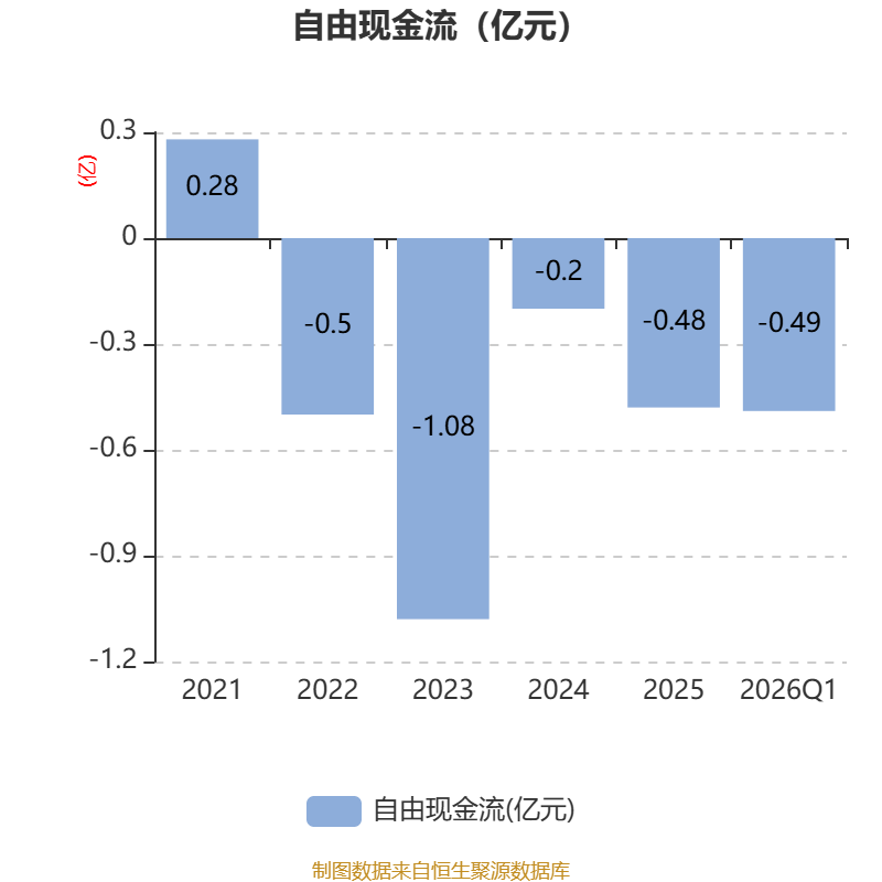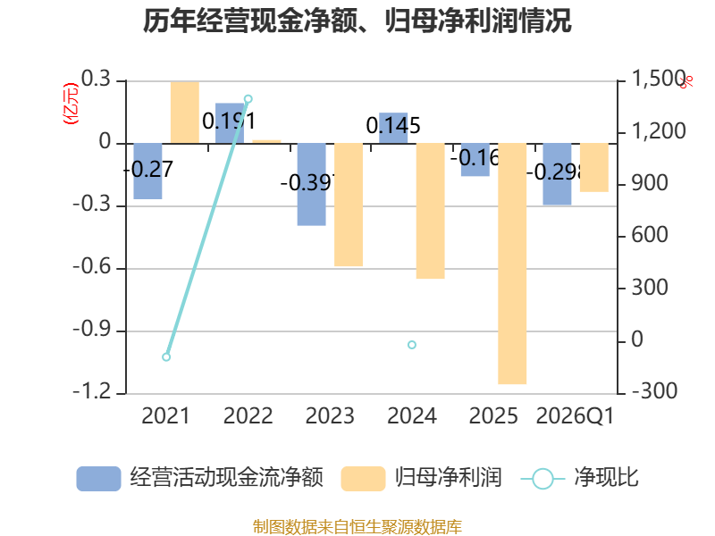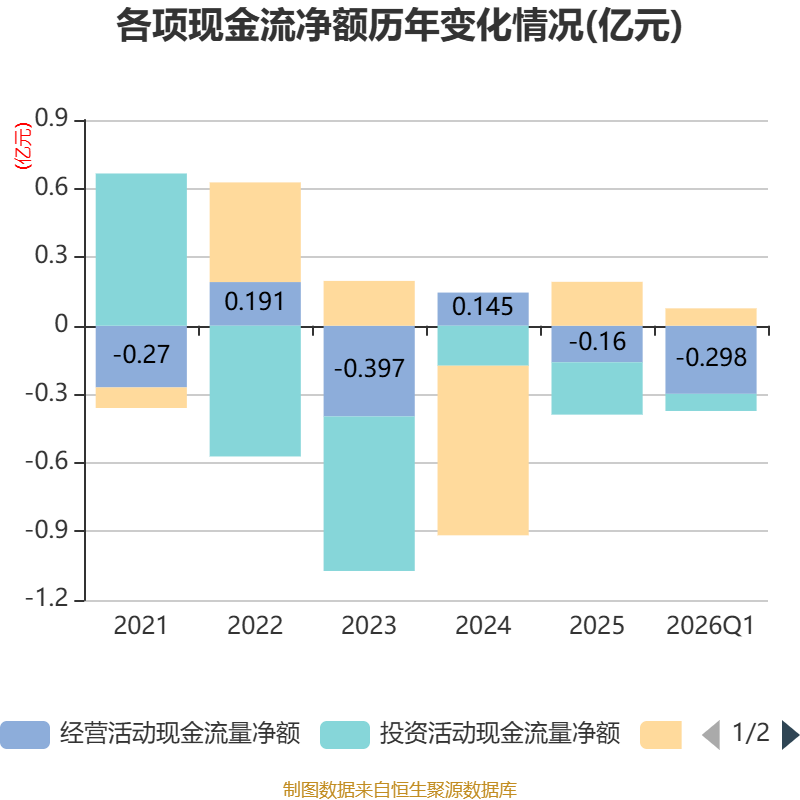 截至2026年一季度末,公司经营活动现金流净额为-2977.76万元,同比减少469.66万元;筹资活动现金流净额758.33万元,同比减少1905.89万元;投资活动现金流净额-751.2万元,上年同期为-443.52万元。