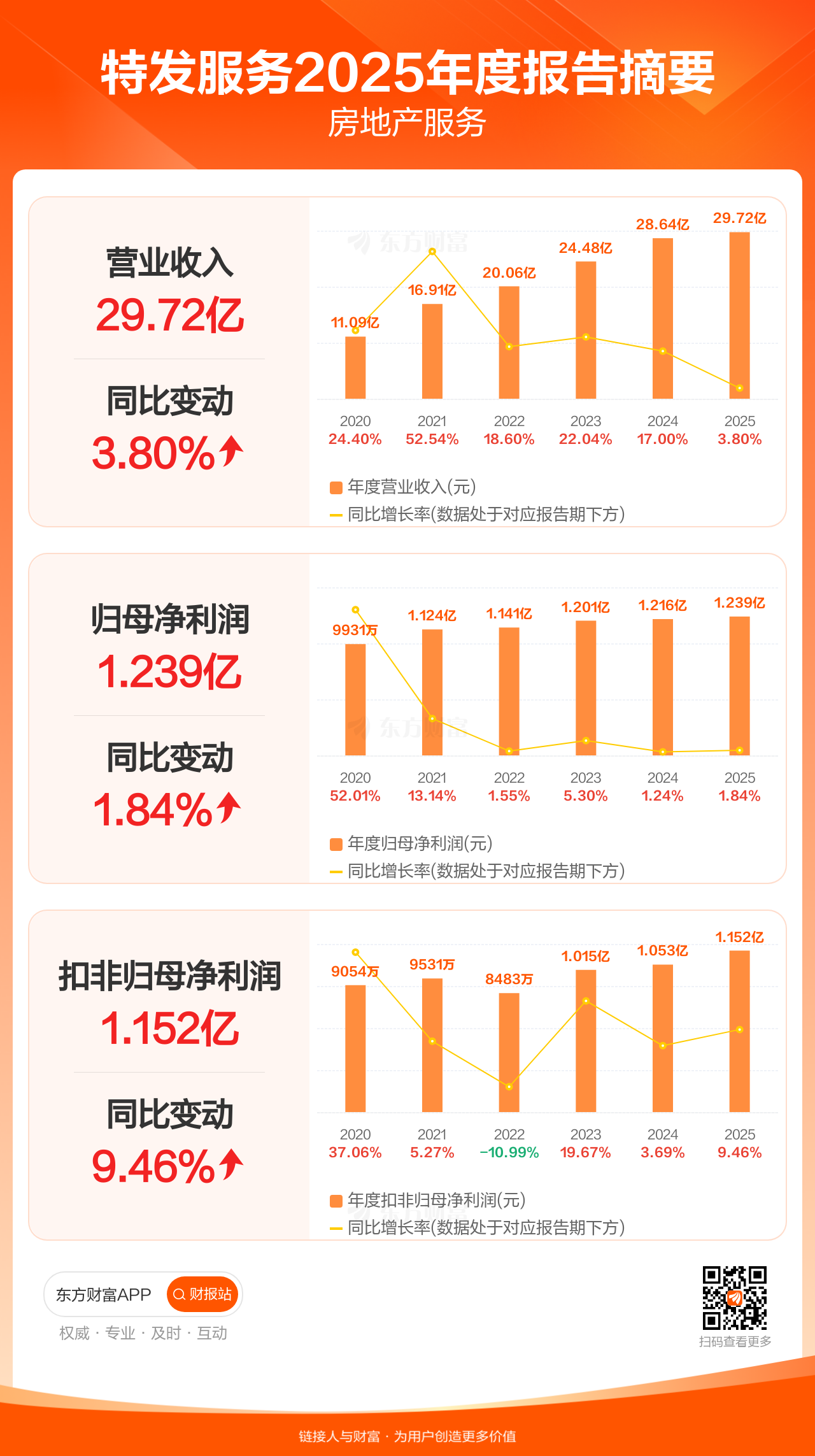 特发服务4月21日发布2025年年报显示,公司全年实现营业收入29.72亿元,同比增长3.80%;归母净利润1.24亿元,同比增长1.84%;扣非归母净利润1.15亿元,同比增长9.46%。