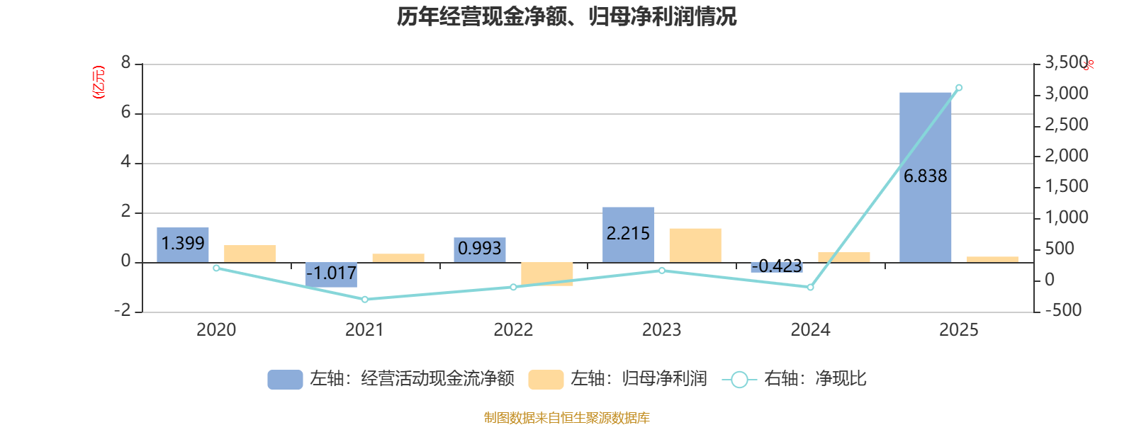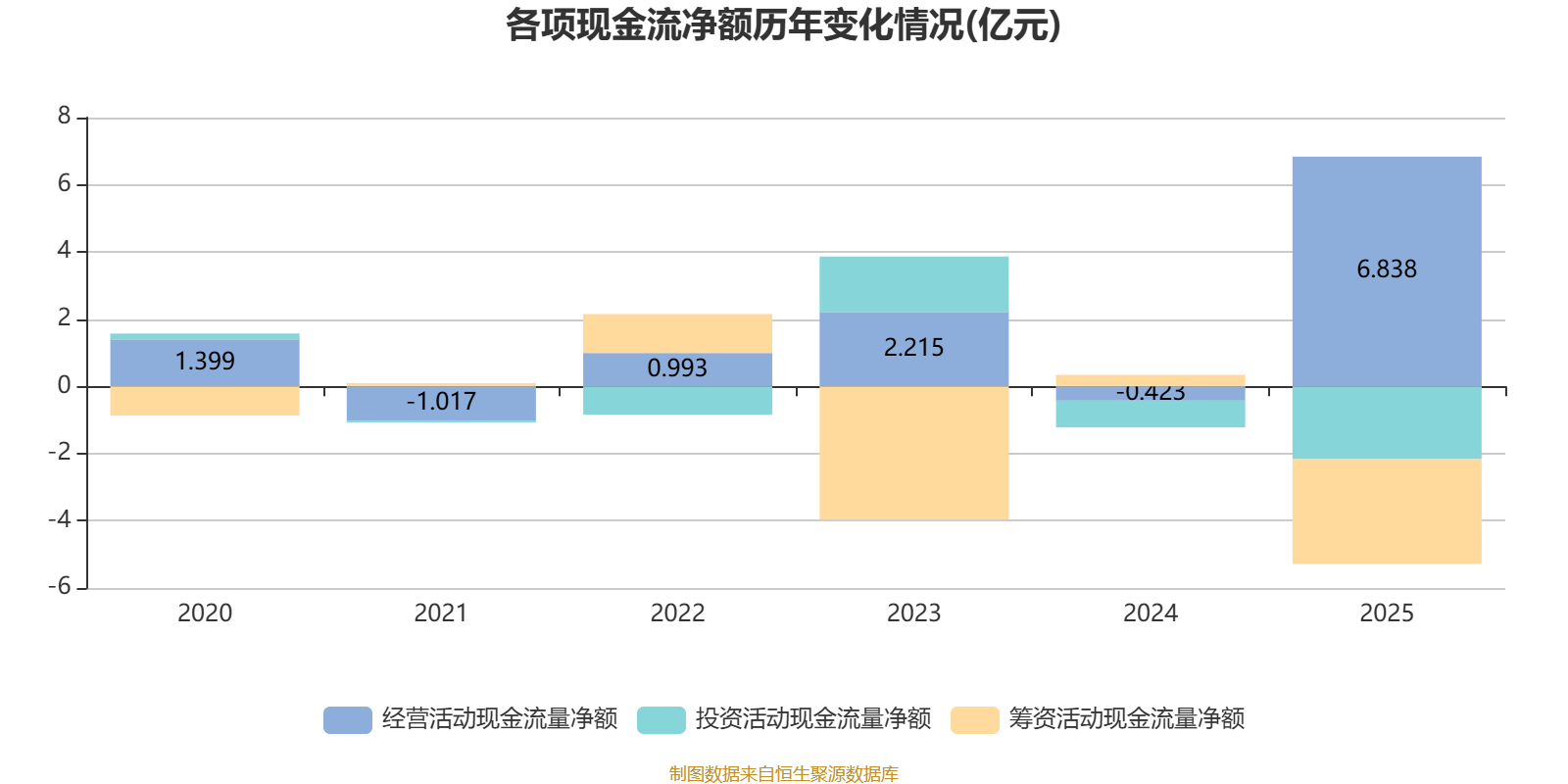 2025年,公司经营活动现金流净额为6.84亿元,同比增加7.26亿元;筹资活动现金流净额-3.12亿元,同比减少3.46亿元;投资活动现金流净额-2.17亿元,上年同期为-7965万元。