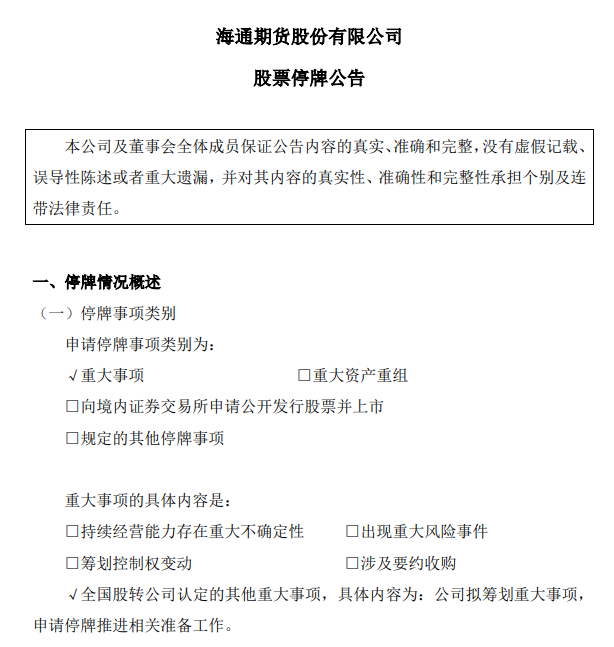 根据公告,海通期货股票自2026年4月21日起停牌,预计将于2026年5月8日前复牌。停牌期间,公司将根据重大事项的进展情况,及时履行信息披露义务,每5个交易日披露一次有关事项的进展情况,待情形消除或充分披露后将及时申请股票复牌。