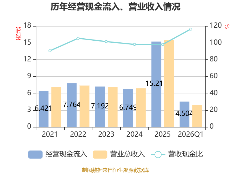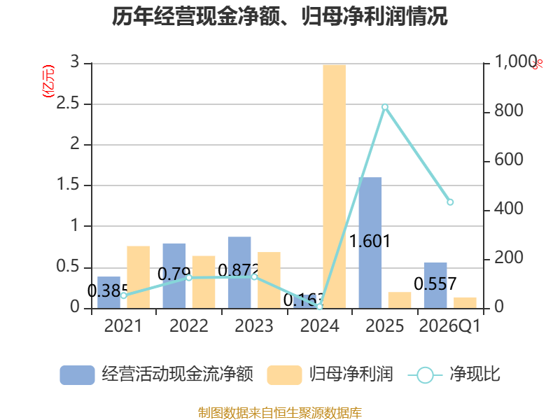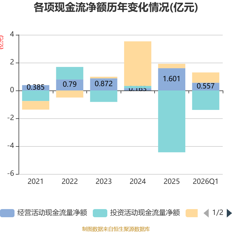 截至2026年一季度末,公司经营活动现金流净额为5568.9万元,同比增长148.89%;筹资活动现金流净额7388.28万元,同比增加4195.94万元;投资活动现金流净额-1.4亿元,上年同期为-3.26亿元。