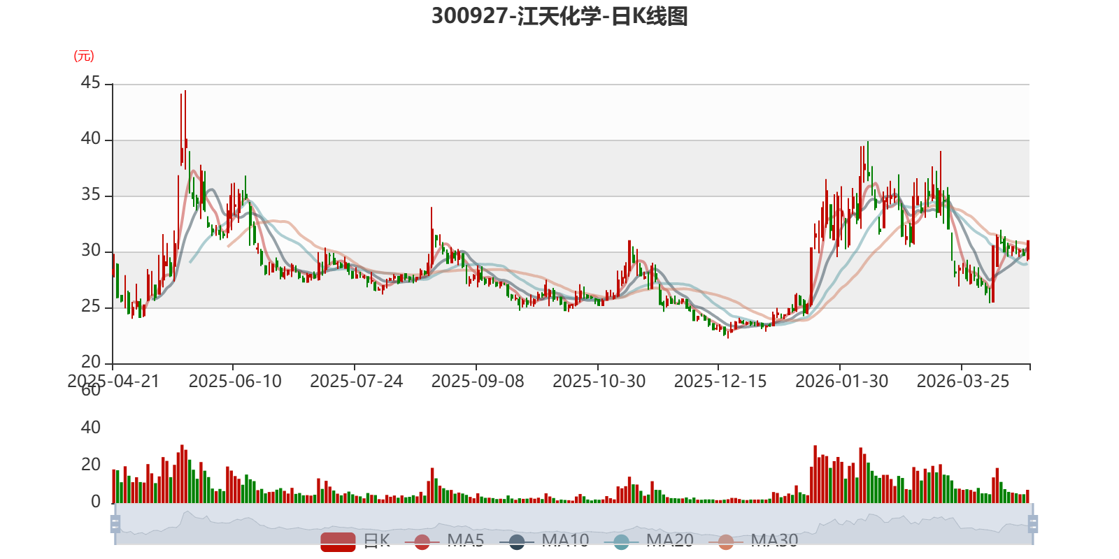 中证智能财讯江天化学(300927)4月21日披露2026年第一季度报告。公司实现营业总收入3.87亿元,同比增长10.54%;归母净利润1288.71万元,同比增长1473.96%;扣非净利润1289.37万元,同比增长4298.16%;经营活动产生的现金流量净额为5568.9万元,同比增长148.89%;报告期内,江天化学基本每股收益为0.0893元,加权平均净资产收益率为1.32%。