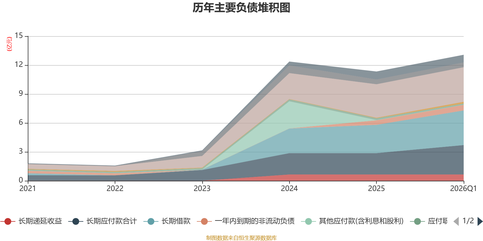 负债重大变化方面,截至2026年一季度末,公司长期应付款合计较上年末增加37.5%,占公司总资产比重上升2.76个百分点;长期借款较上年末增加22.55%,占公司总资产比重上升1.74个百分点;应付票据及应付账款较上年末增加3.11%,占公司总资产比重下降0.89个百分点;合同负债较上年末增加245.01%,占公司总资产比重上升0.52个百分点。