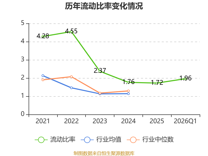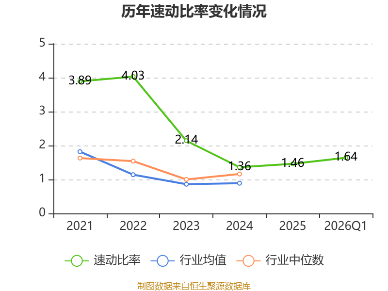 2026年第一季度,公司流动比率为1.96,速动比率为1.64。