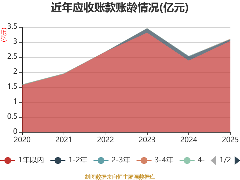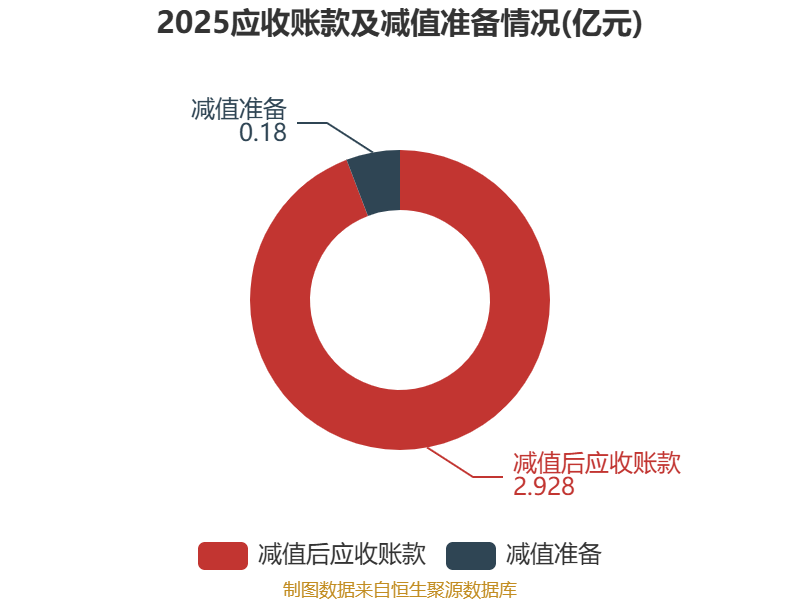 从应收账款账龄结构来看,截至2025年末,公司账龄在1年以内的应收账款余额为3.03亿元,较上年末增长6533.5万元,占应收账款总额比例为97.63%,较上年末上升3.64个百分点。