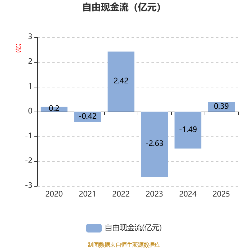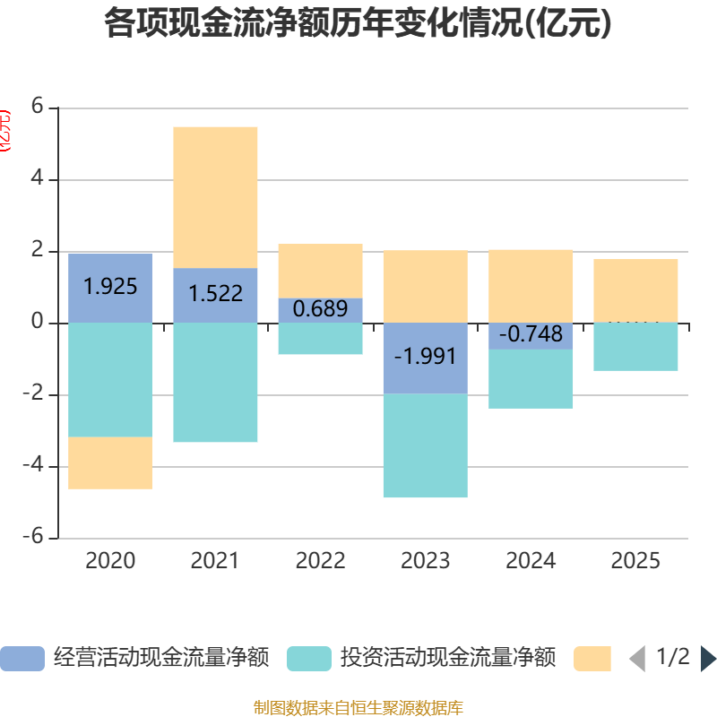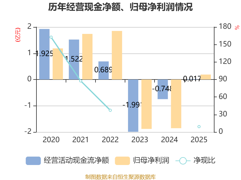 截至2025年,公司经营活动现金流净额为173.88万元,同比增加7650.45万元;筹资活动现金流净额1.76亿元,同比减少2753.5万元;投资活动现金流净额-1.35亿元,上年同期为-1.65亿元。