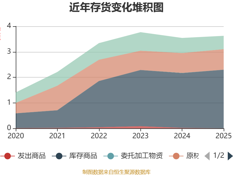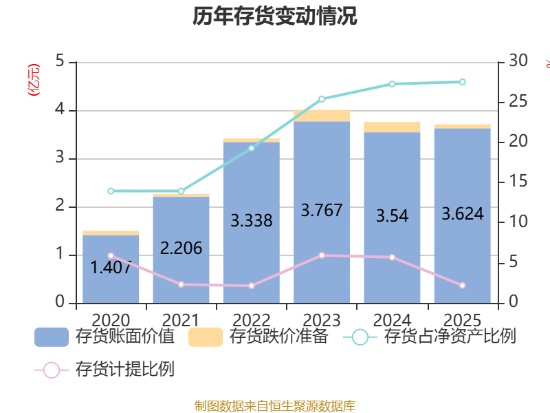从存货变动来看,截至2025年末,公司存货账面价值为3.62亿元,占净资产的27.51%,较上年末增加837.61万元。其中,存货跌价准备为805.21万元,计提比例为2.17%。