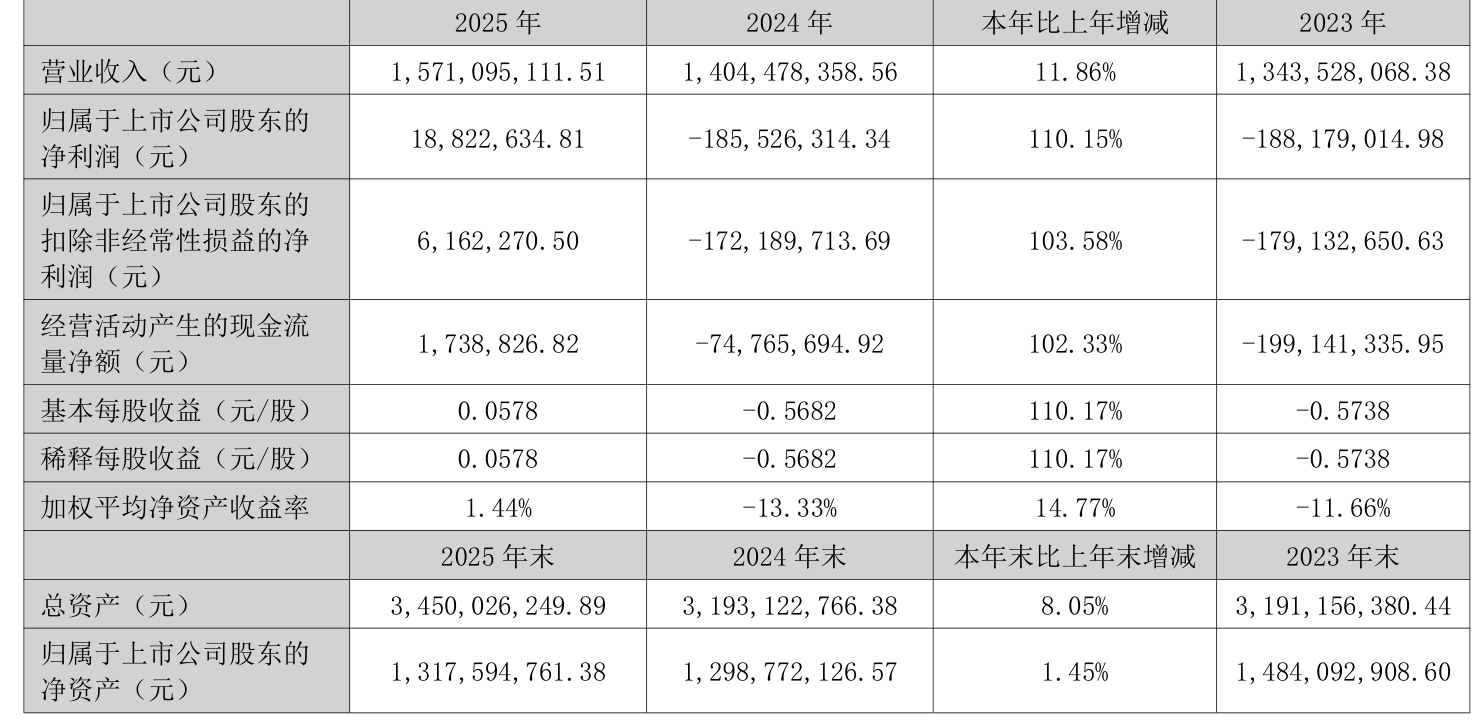 中证智能财讯中欣氟材(002915)4月21日披露2025年年度报告。2025年,公司实现营业总收入15.71亿元,同比增长11.86%;归母净利润1882.26万元,同比扭亏;扣非净利润616.23万元,同比扭亏;经营活动产生的现金流量净额为173.88万元,上年同期为-7476.57万元;报告期内,中欣氟材基本每股收益为0.0578元,加权平均净资产收益率为1.44%。
