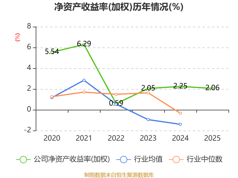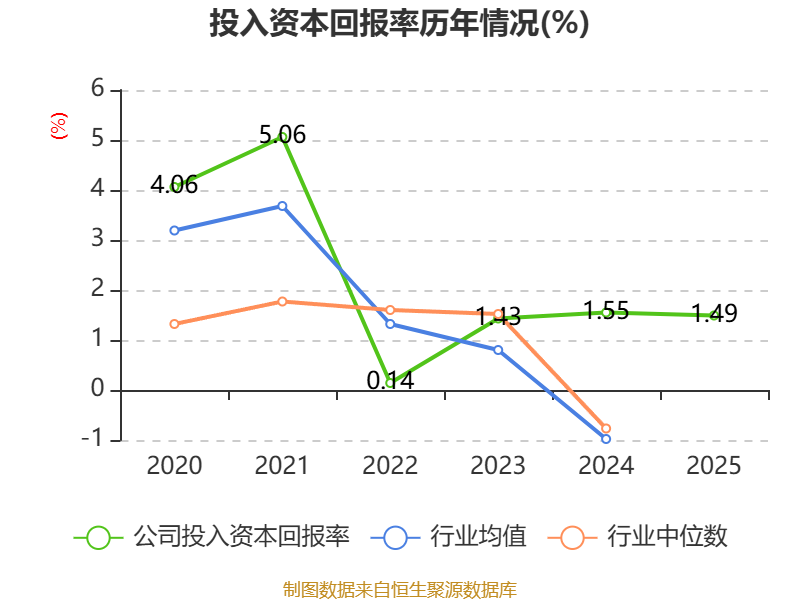 数据显示,2025年公司加权平均净资产收益率为2.06%,较上年同期下降0.19个百分点。公司2025年投入资本回报率为1.49%,较上年同期下降0.06个百分点。