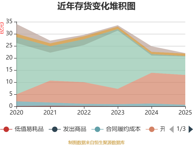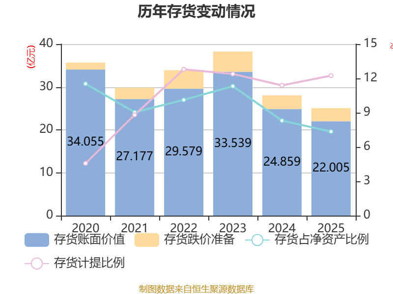 从存货变动来看,截至2025年末,公司存货账面价值为22亿元,占净资产的7.35%,较上年末减少2.85亿元。其中,存货跌价准备为3.07亿元,计提比例为12.24%。