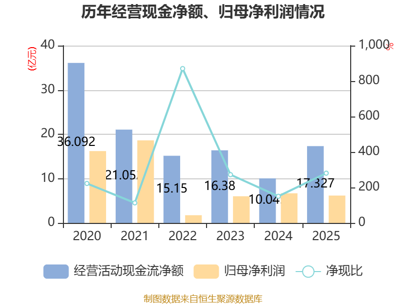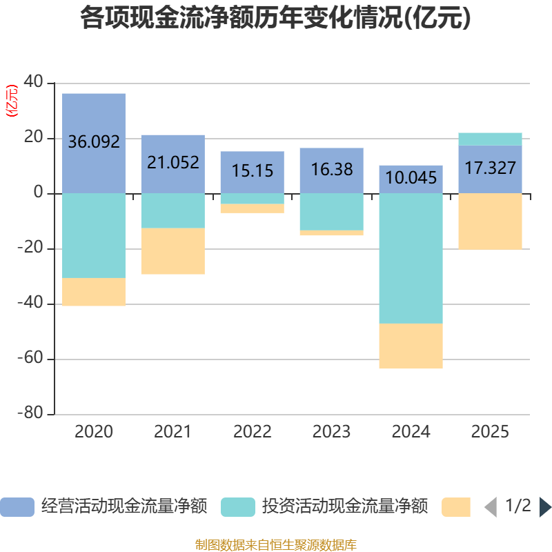 截至2025年,公司经营活动现金流净额为17.33亿元,同比增长72.49%;筹资活动现金流净额-20.45亿元,同比减少4.17亿元;投资活动现金流净额4.53亿元,上年同期为-47.23亿元。