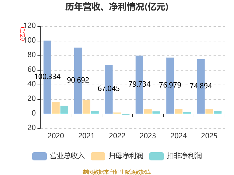中证智能财讯东方明珠(600637)4月21日披露2025年年度报告。2025年,公司实现营业总收入74.89亿元,同比下降2.71%;归母净利润6.17亿元,同比下降7.66%;扣非净利润3.89亿元,同比增长47.57%;经营活动产生的现金流量净额为17.33亿元,同比增长72.49%;报告期内,东方明珠基本每股收益为0.1837元,加权平均净资产收益率为2.06%。公司2025年度分配预案为:拟向全体股东每10股派现1.3元(含税)。