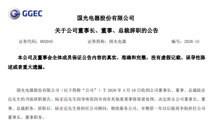 同日,国光电器公告,陆宏达以相同原因辞去公司董事长、董事、总裁职务。