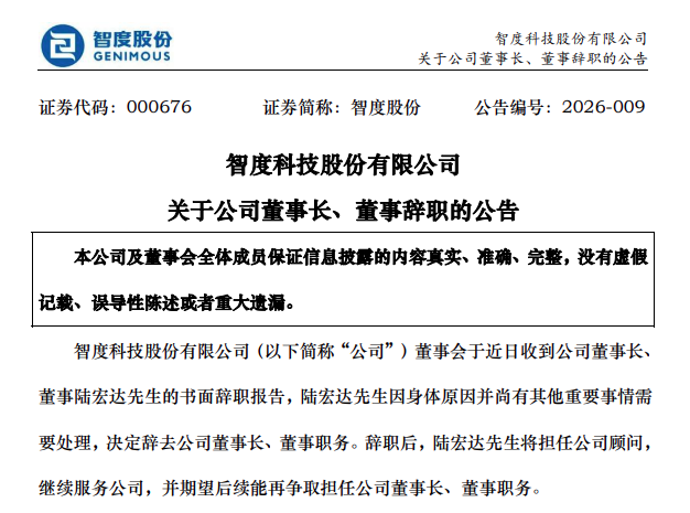公告显示,智度股份副总经理、董事会秘书杨燕芳于2025年12月以“个人原因”辞去公司所有职务。随后,代为履行董秘职责先是落到公司副董事长、总经理陈志峰的头上,2026年2月,陈志峰同样以“个人原因”辞去公司所有职务,由陆宏达代为履行董秘职责。