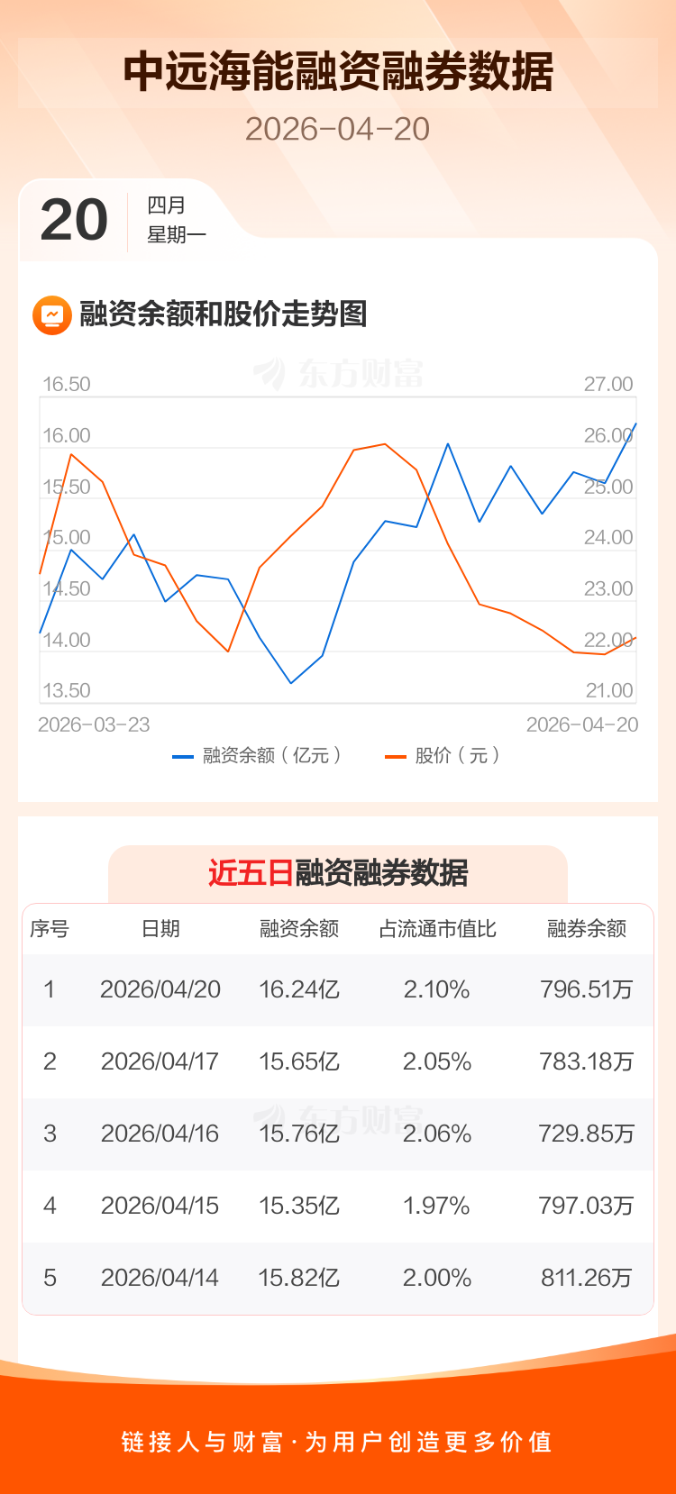 交易所最新数据显示,中远海能于2026年4月20日获融资买入1.69亿元,融资偿还1.10亿元,当日融资净买入5916.11万元。目前,该股融资余额16.24亿,占流通市值比例为2.10%。