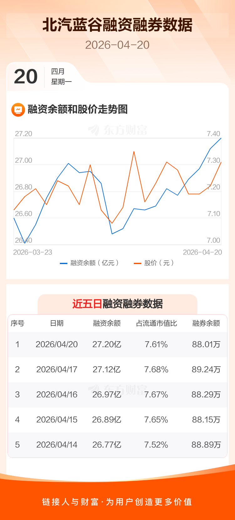 交易所最新数据显示,北汽蓝谷于2026年4月20日获融资买入4028.14万元,融资偿还3248.91万元,当日融资净买入779.23万元。目前,该股融资余额27.20亿,占流通市值比例为7.61%。