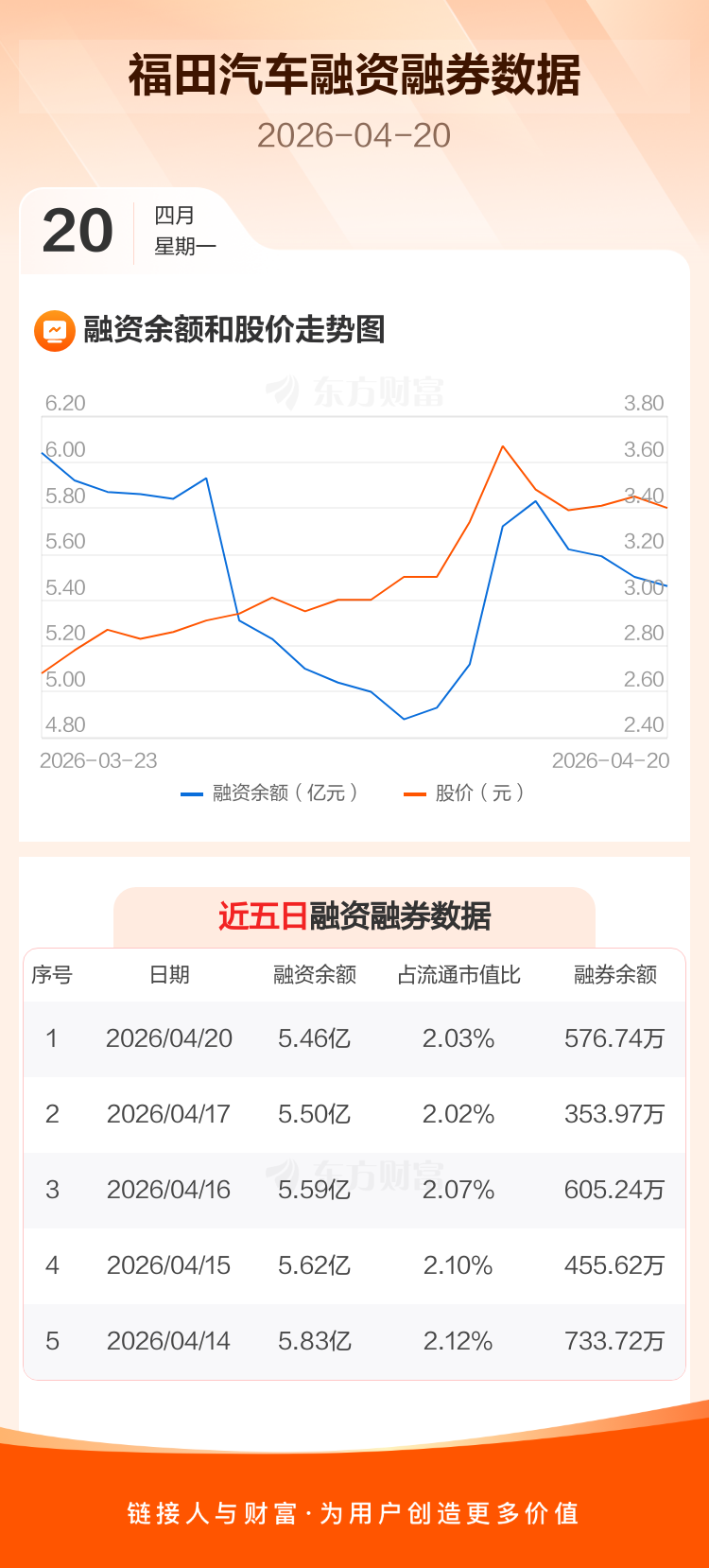 交易所最新数据显示,福田汽车于2026年4月20日获融资买入5631.66万元,融资偿还6116.80万元,当日融资净偿还485.14万元。目前,该股融资余额5.46亿,占流通市值比例为2.03%。