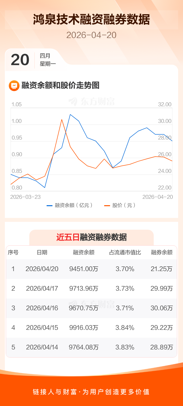 交易所最新数据显示,鸿泉技术于2026年4月20日获融资买入761.52万元,融资偿还1024.48万元,当日融资净偿还262.96万元。目前,该股融资余额9451.00万,占流通市值比例为3.70%。