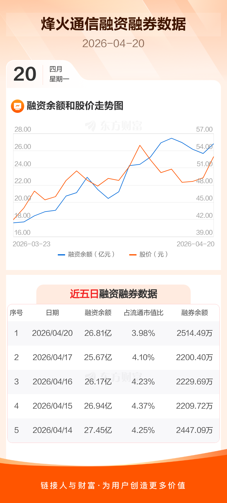 交易所最新数据显示,烽火通信于2026年4月20日获融资买入8.30亿元,融资偿还7.16亿元,当日融资净买入1.14亿元。目前,该股融资余额26.81亿,占流通市值比例为3.98%。