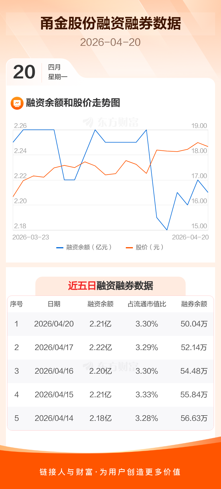 交易所最新数据显示,甬金股份于2026年4月20日获融资买入769.61万元,融资偿还866.01万元,当日融资净偿还96.4万元。目前,该股融资余额2.21亿,占流通市值比例为3.30%。