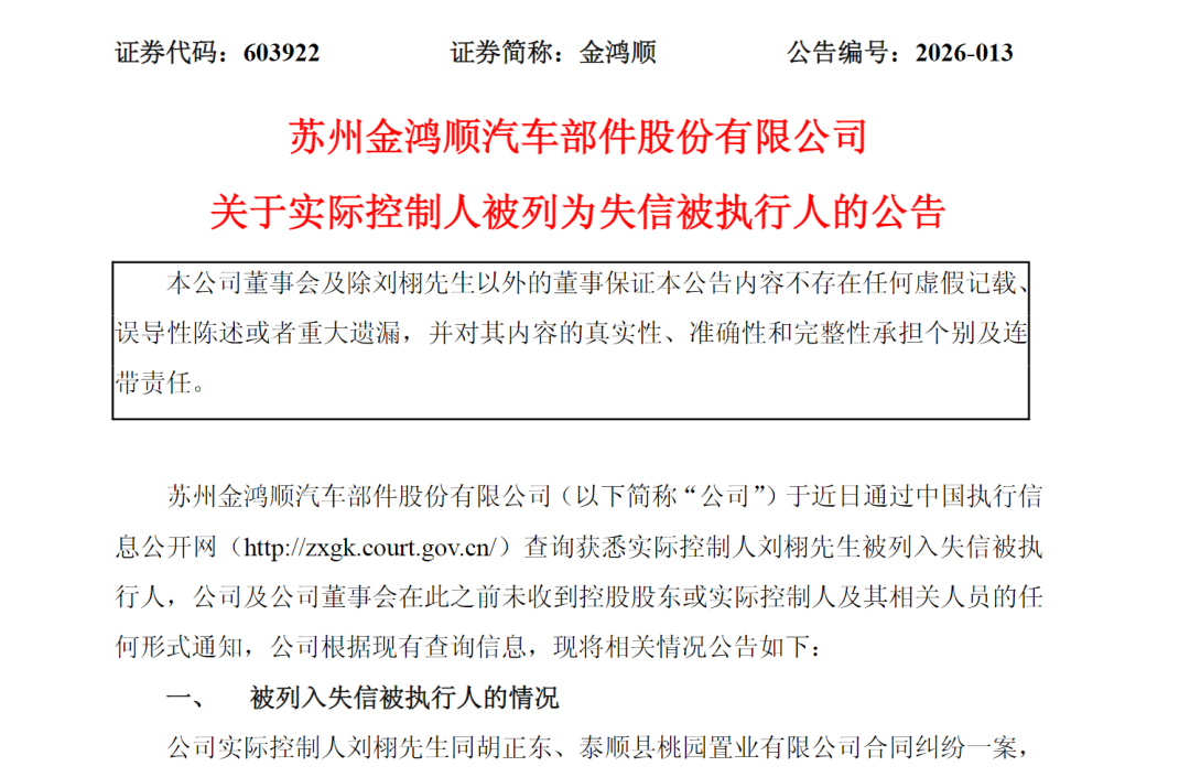 4月20日,金鸿顺公告称,公司于近日获悉实际控制人刘栩被列入失信被执行人,公司及公司董事会在此之前未收到控股股东或实际控制人及其相关人员的任何形式通知。公司将按照相关规定解除刘栩的非独立董事职务。