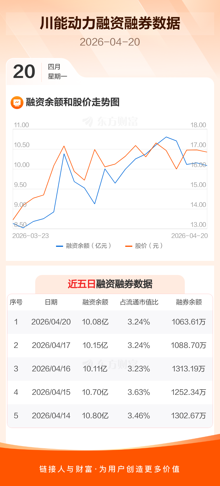 交易所最新数据显示,川能动力于2026年4月20日获融资买入1.10亿元,融资偿还1.18亿元,当日融资净偿还766.54万元。目前,该股融资余额10.08亿,占流通市值比例为3.24%。