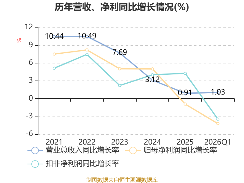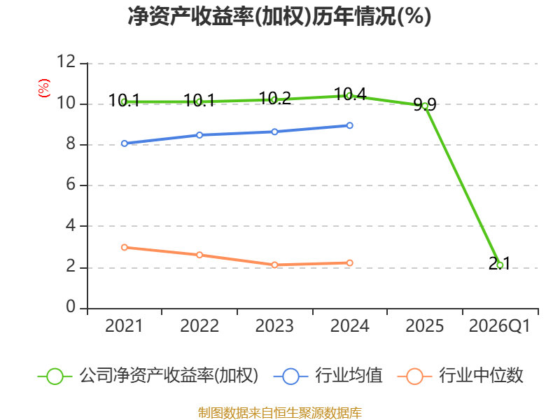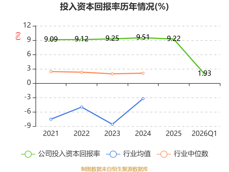 盈利能力方面, 2026年一季度公司加权平均净资产收益率为2.1%,同比下降0.1个百分点。公司2026年第一季度投入资本回报率为1.93%,较上年同期下降0.12个百分点。