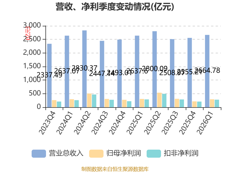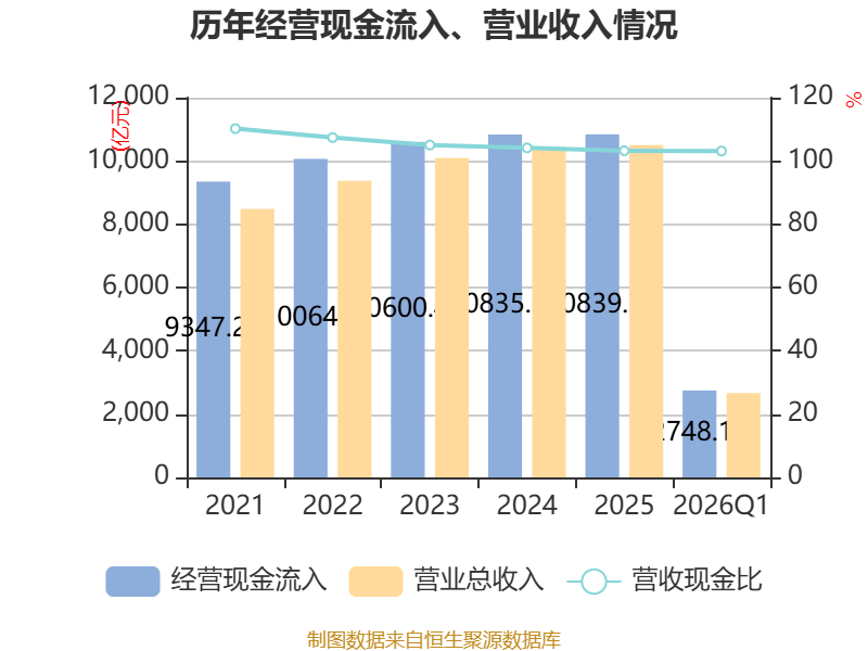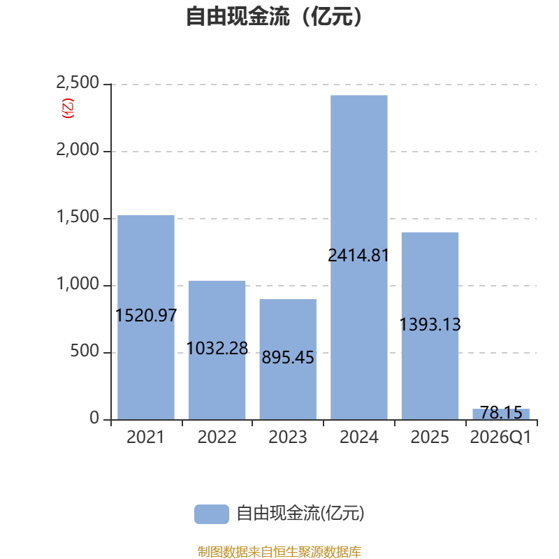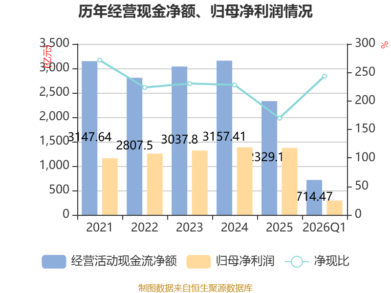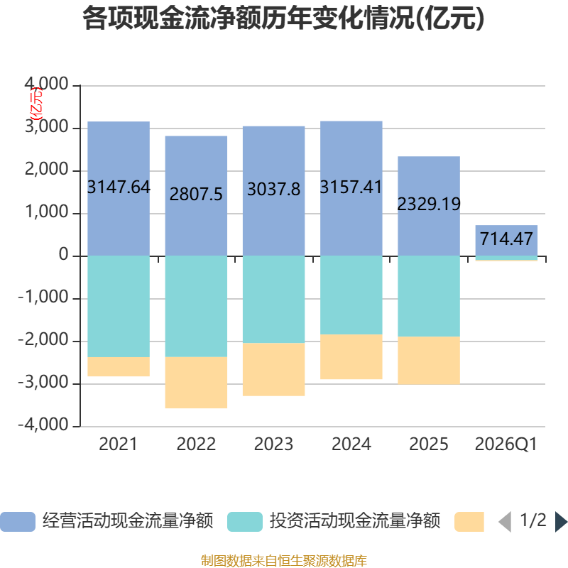 截至2026年一季度末,公司经营活动现金流净额为714.47亿元,同比增长128.14%;筹资活动现金流净额-23.47亿元,同比减少46.52亿元;投资活动现金流净额-107.45亿元,上年同期为-757.99亿元。