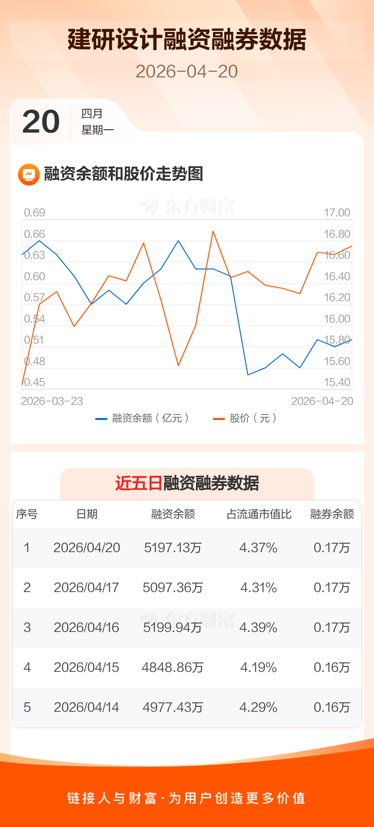 交易所最新数据显示,建研设计于2026年4月20日获融资买入268.45万元,融资偿还168.69万元,当日融资净买入99.76万元。目前,该股融资余额5197.13万,占流通市值比例为4.37%。