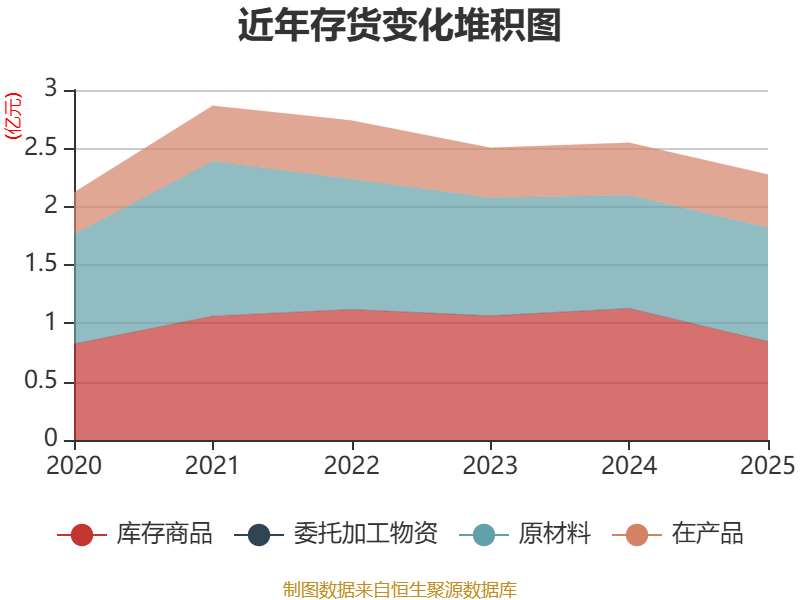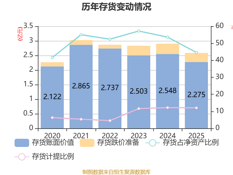 从存货变动来看,截至2025年末,公司存货账面价值为2.27亿元,占净资产的44.57%,较上年末减少2736.54万元。其中,存货跌价准备为3113.31万元,计提比例为12.04%。