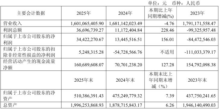 中证智能财讯凤凰光学(600071)4月21日披露2025年年度报告。2025年,公司实现营业总收入16.01亿元,同比下降4.76%;归母净利润3442.23万元,同比增长156.01%;扣非净利润524.83万元,同比扭亏;经营活动产生的现金流量净额为1.61亿元,同比增长127.28%;报告期内,凤凰光学基本每股收益为0.12元,加权平均净资产收益率为6.99%。
